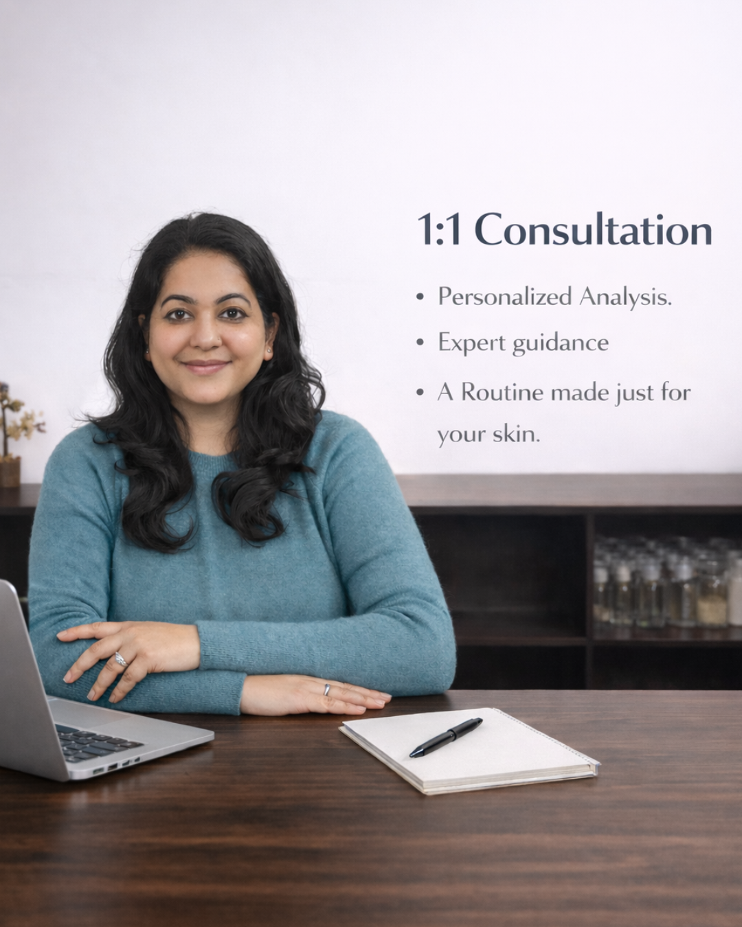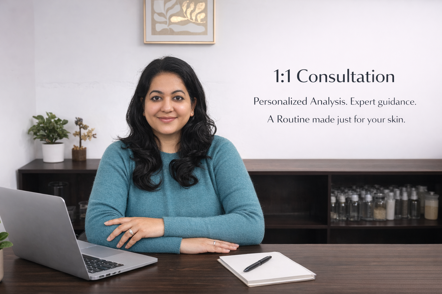 We offer personalized skincare consultations to determine your skin type, concerns, and goals. Nowadays many people know what active ingredient will suit them ,but they keep on using the same active ingredient for years,this makes the skin sensitive by the time you are into your 40’s. We provide you with complete guidelines for this with regular follow ups and recommend a customized routine using our plant-based formulations.